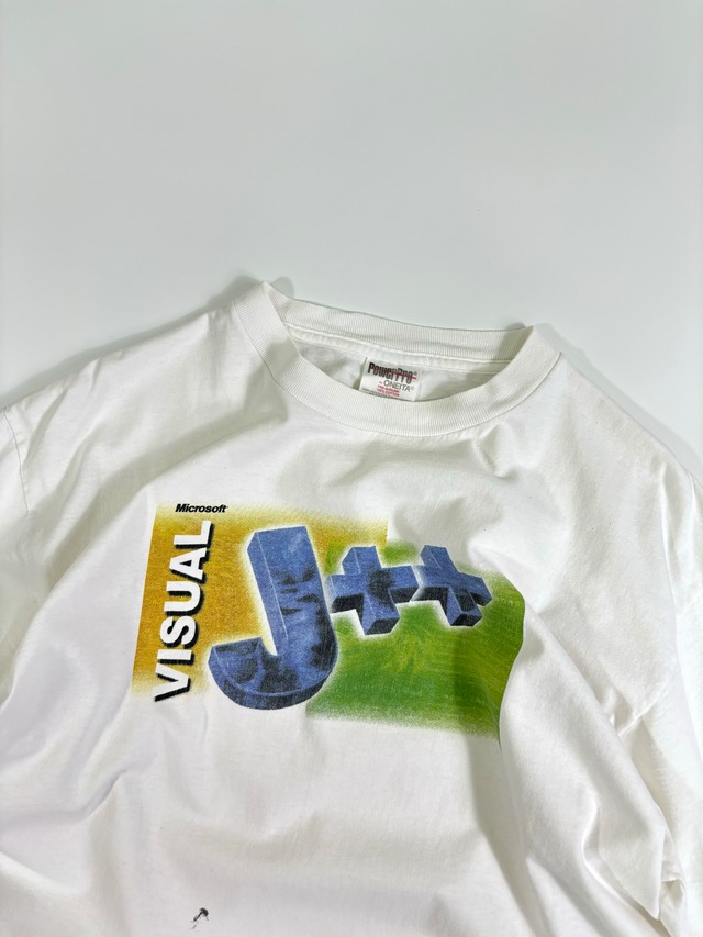 90年代頃のマイクロソフトアイテム 高騰してる古着の一つですね やっぱりデザインが秀逸なのも人気の理由かと ちなみにVISUAL J++は1996年〜2004年まで 開発販売されていたソフトだそうです •FABRIC コットン 100% •CONDITION 所々インク汚れのような物があります •SIZE XL 着丈 70.5 身幅 57 肩幅 54 袖丈 21 ●平置き採寸のため、実寸と若干の誤差がある場合があります。 ●照明により実物と色合いが違って見える場合があります。 ●こちらは古着の商品になります。 汚れや状態などあくまでUSED商品であることをご理解の上お求めください。